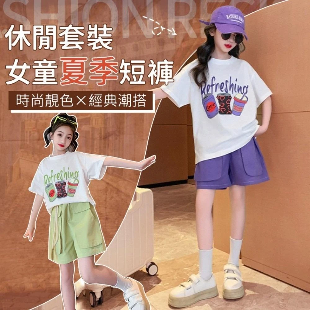 綺羅 女童運動服✨兒童運動套裝 女童套裝2025春夏新款學生洋氣中大童短袖休閑運動T恤+短褲兩件套