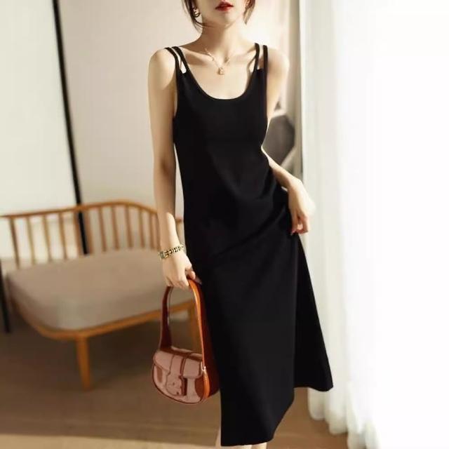 綺羅 大尺碼女裝連衣裙 雙肩帶細肩帶吊帶平口氣質洋裝 黑色顯瘦收腰chic連身裙/ins 休閒長裙 日系海邊度假