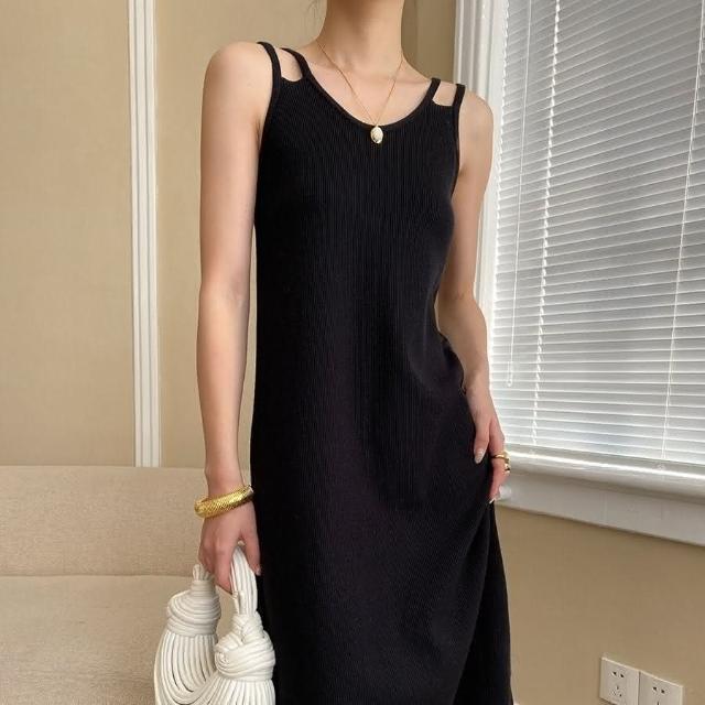 綺羅 大尺碼女裝連衣裙 雙肩帶細肩帶吊帶平口氣質洋裝 黑色顯瘦收腰chic連身裙/ins 休閒長裙 日系海邊度假