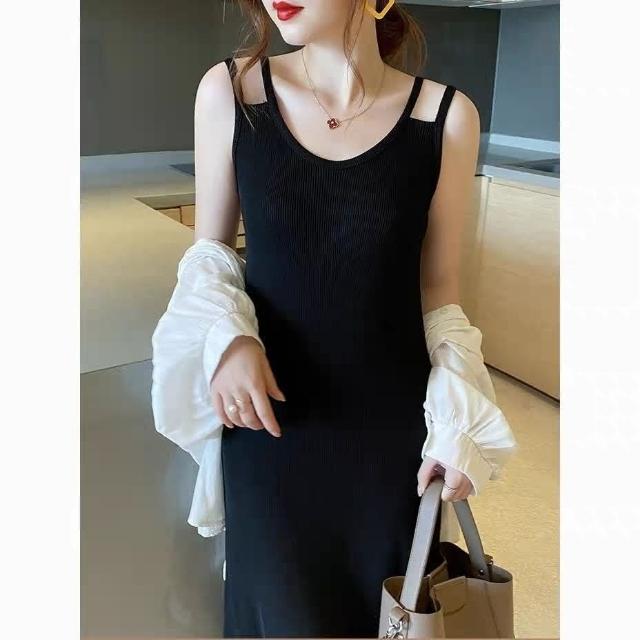 綺羅 大尺碼女裝連衣裙 雙肩帶細肩帶吊帶平口氣質洋裝 黑色顯瘦收腰chic連身裙/ins 休閒長裙 日系海邊度假