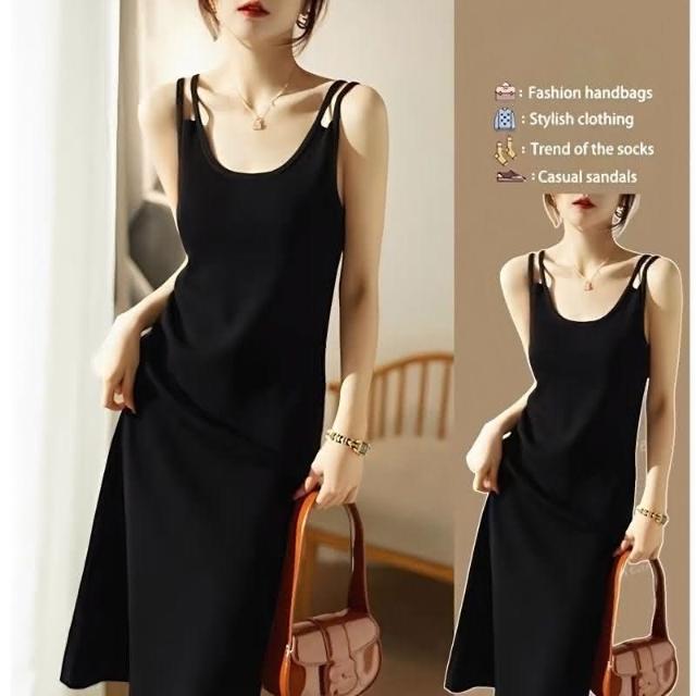 綺羅 大尺碼女裝連衣裙 雙肩帶細肩帶吊帶平口氣質洋裝 黑色顯瘦收腰chic連身裙/ins 休閒長裙 日系海邊度假