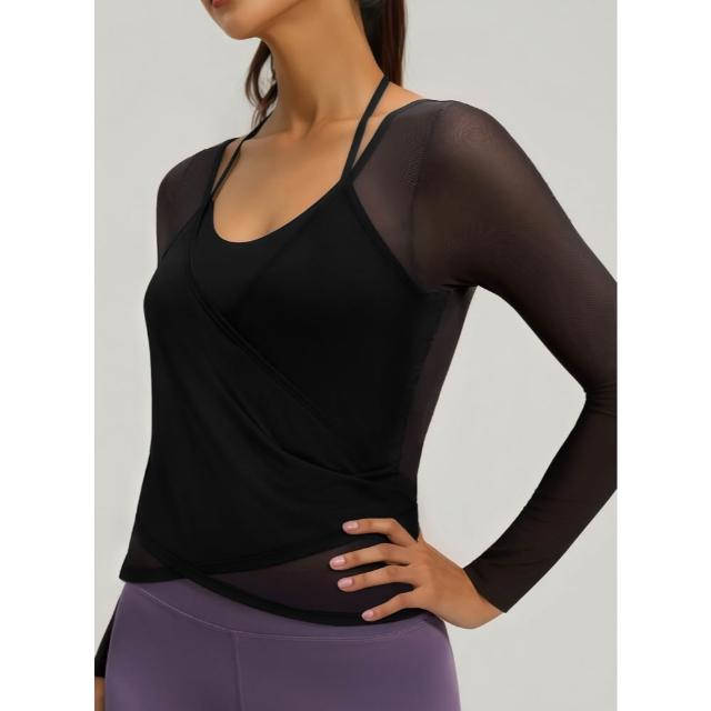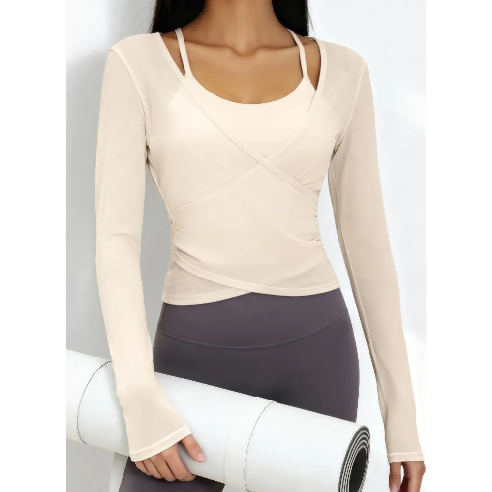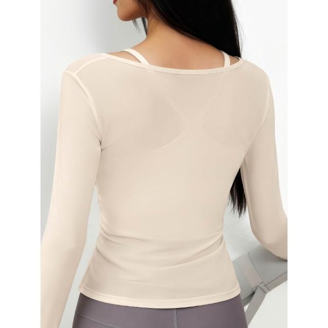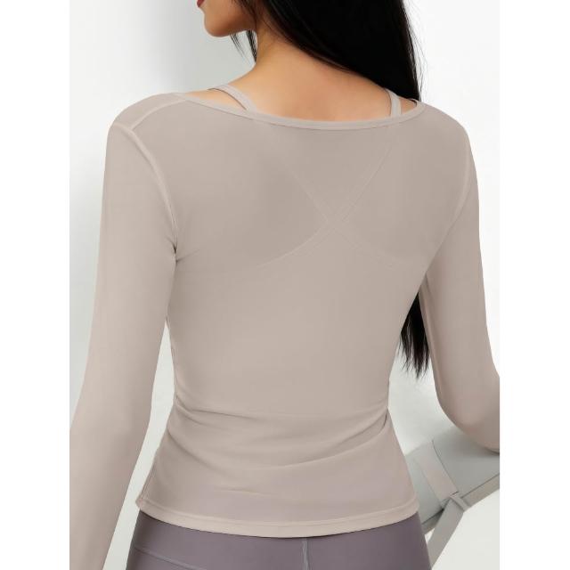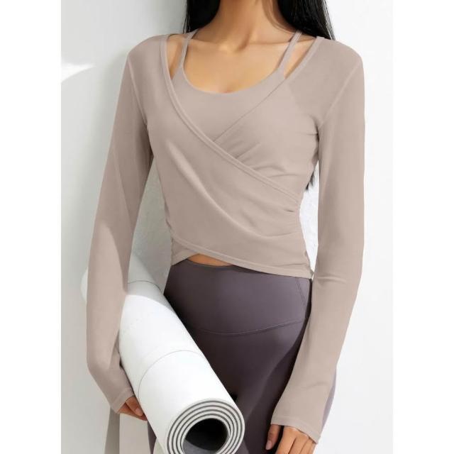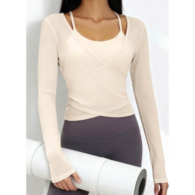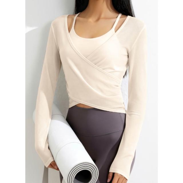 FT SHOP氣質輕柔交叉兩件式長袖運動上衣 內含運動內衣 瑜珈上衣 健身上衣 舒適透氣 健身 瑜伽 跑步 有氧