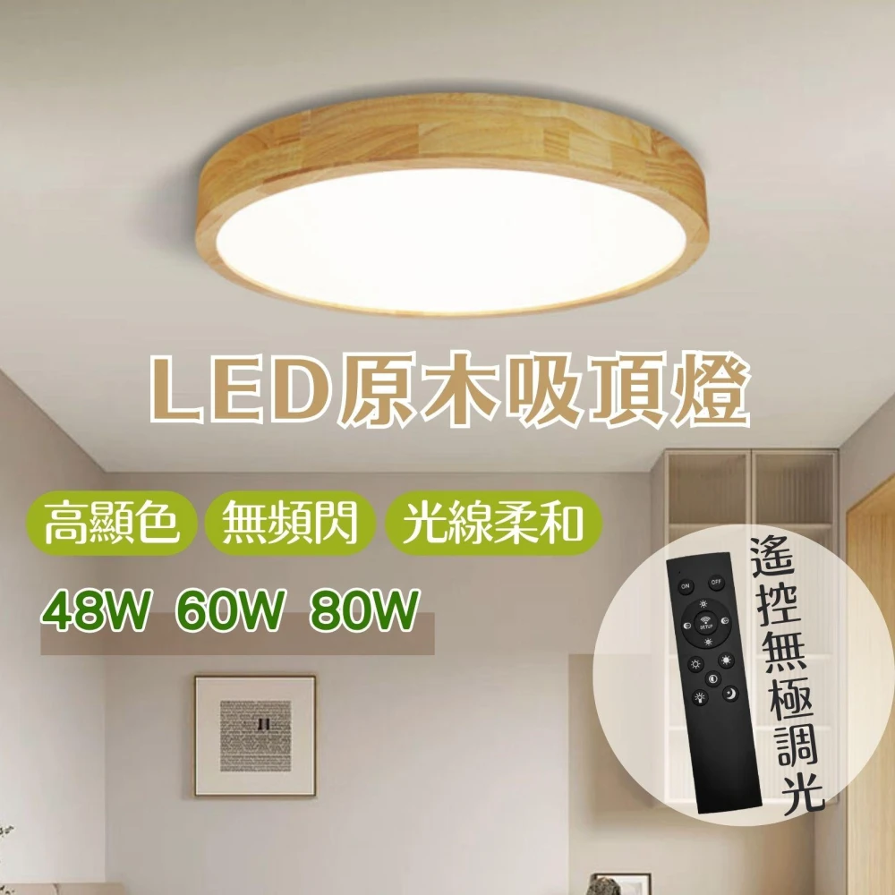 原木LED吸頂燈60W無極調光|遙控器|木紋實木|LED晶片|北歐日式風|客廳燈|房間燈