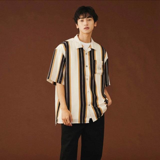 Muscle Shot復古風條紋襯衫|寬鬆落肩 男襯衫 夏季短袖 花襯衫 日系風 韓系薄款 寬版條紋襯衫 男生上衣 襯衫男