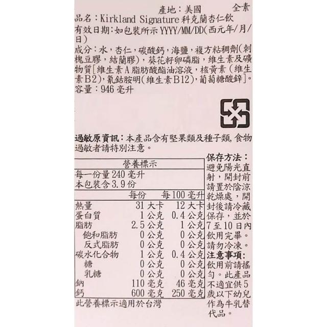 Kirkland Signature 科克蘭杏仁飲 946ML (美國 加州 杏仁奶 杏仁 維生素 礦物質 不含反式脂肪 素食)