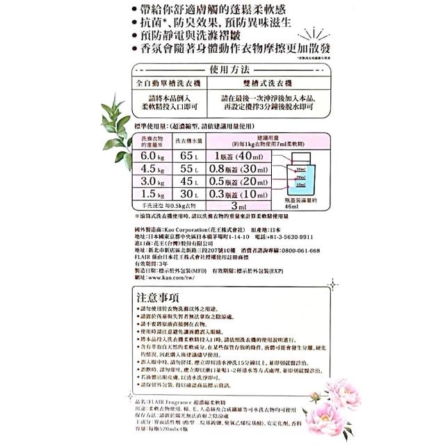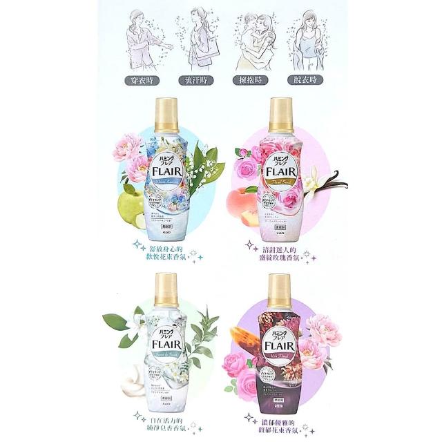 Kao 花王Flair 超濃縮柔軟精 520毫升 4入 (抗菌 防臭 防靜電 玫瑰 皂香 花香 超濃縮 柔軟精)