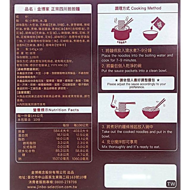 金博家正宗四川担担麵 145公克 10入 ( 担担麵 油香 麻辣 胡麻 乾麵 紅油 芝麻醬 全素 )