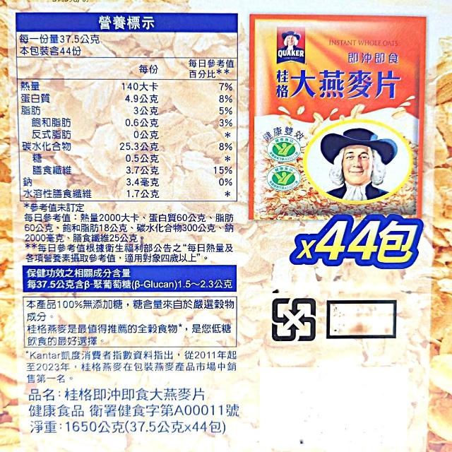 QUAKER 桂格即食大燕麥片隨身包 37.5克 44入 (即沖即食 大燕麥片 燕麥片 燕麥 麥片 隨身包)