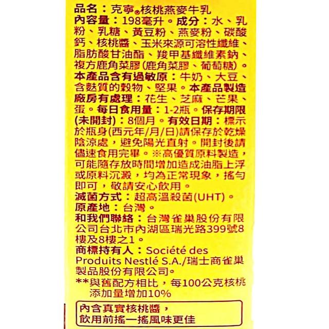 KLIM 克寧核桃燕麥牛乳 198ml 24入 (保久乳 核桃 燕麥 高鈣 膳食纖維 益生菌)