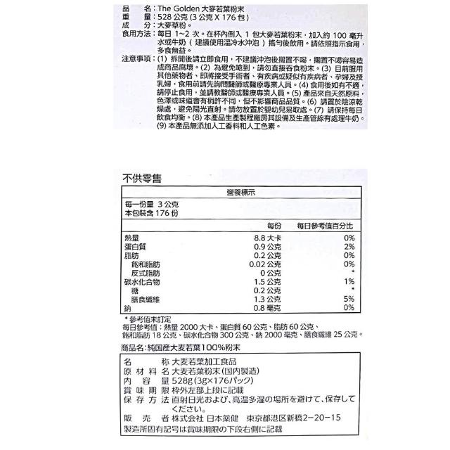 大麥若葉The Golden 大麥若葉粉末 3公克 176包 (膳食纖維 大麥若葉 青汁 纖維 大麥 日本產 獨立包裝 隨身包)