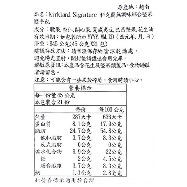 Kirkland Signature 科克蘭無調味綜合堅果隨手包 45公克 21包 (無調味 腰果 杏仁 開心果 夏威夷果仁 巴西堅果 隨手包 )