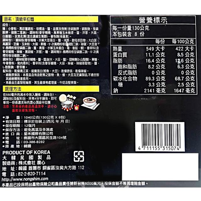 NONG SHIM 農心黑辛拉麵 130公克 8包 (頂級 香濃微辣牛骨湯頭)