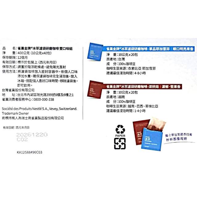 Nestle 雀巢金牌冰萃濾袋雙口味組 10公克 40入 (耶加雪菲 深焙堅果 中烘焙 深烘焙 冷泡 黑咖啡)