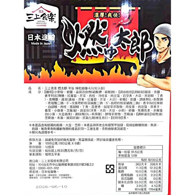三上食楽燃太郎 辣乾細麵 183公克 6包 (辛旨 日式炒麵 乾麵 辣乾麵 細麵)