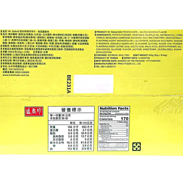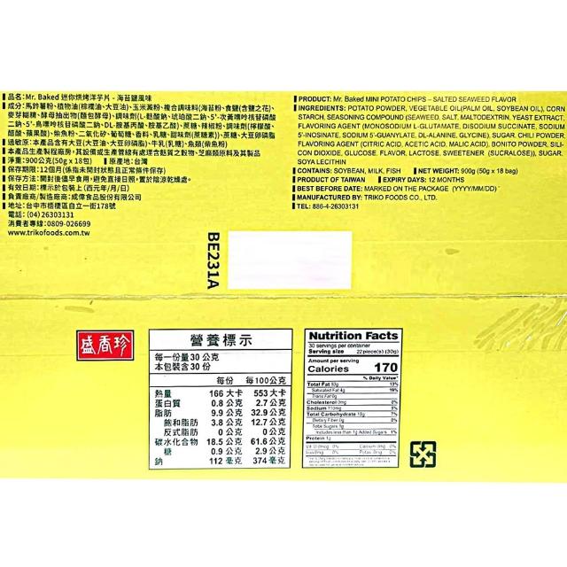 盛香珍Mr.Baked 迷你烘烤洋芋片 海苔鹽風味 50公克 18包 (非油炸 海苔 鹽之花 迷你 洋芋片 薯片)