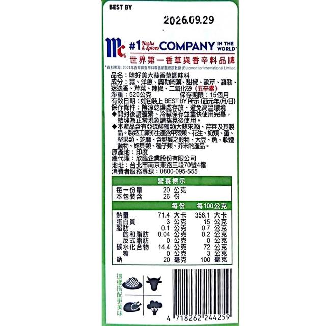 味好美大蒜香草調味料 520公克 (大蒜 香草 洋蔥 奧勒岡 羅勒 迷迭香 芹菜 辣椒 甜椒 印度)