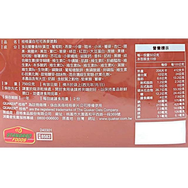 QUAKER 桂格蛋白可可燕麥脆穀 750克 (蛋白質 鈣 鐵 鋅 鎂 燕麥 可可)
