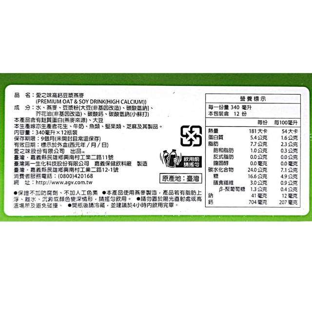 愛之味豆漿燕麥 340毫升 12 入 (無添加糖 零膽固存 非基改黃豆 豆漿 燕麥)