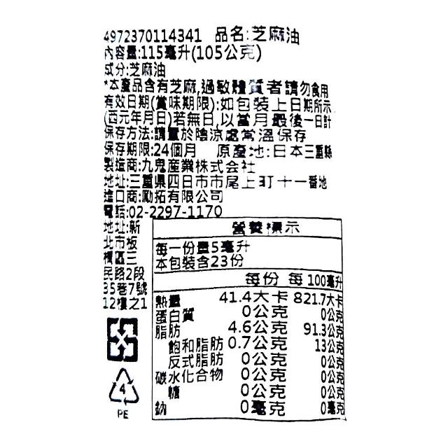 日本九鬼芳醇胡麻油 105公克 (麻油 香油 芝麻油 白芝麻 芳醇 日本進口)