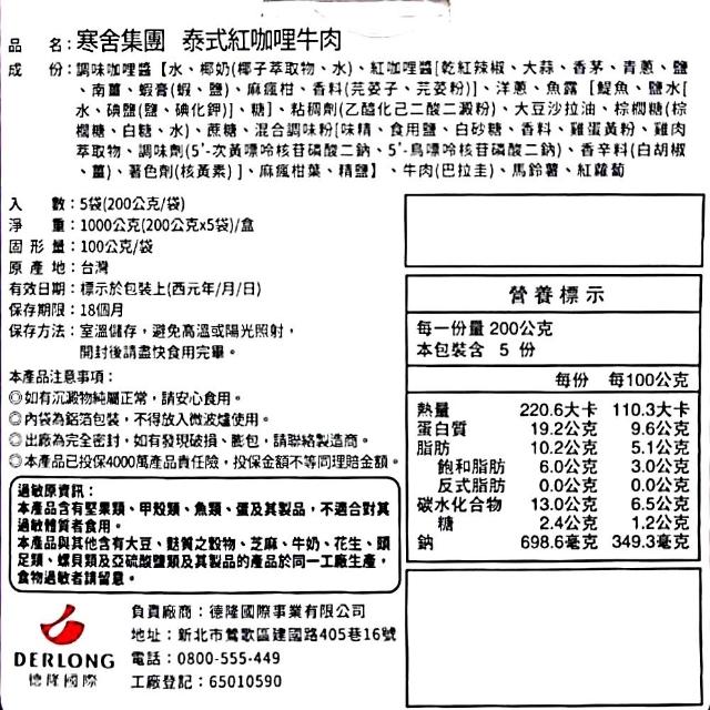 寒舍集團泰式牛肉紅咖哩 200公克 5入 (泰式咖哩 牛肉咖哩 紅咖哩 辛香料 椰奶)