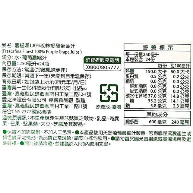 嘉紛娜100% 初榨多酚葡萄汁 250毫升 24入 (無添加糖 100% 葡萄汁)