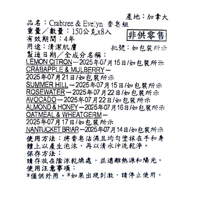 Crabtree&Evelyn 瑰柏翠香皂禮盒組 150公克 8入 (香皂禮盒 禮盒 玫瑰水 燕麥 夏日山丘 海棠果 酪梨 檸檬 杏仁 水澤香蕀叢花)