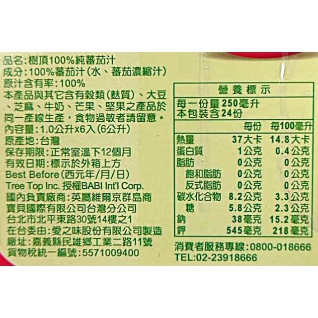 Tree Top 樹頂100% 純番茄汁 1公升 6入 (番茄汁 Tomato Juice)