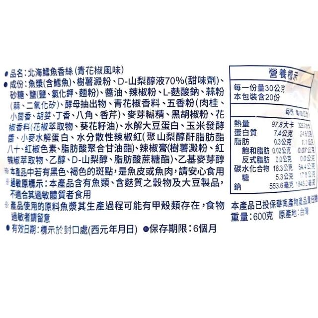 北海鱈魚香絲 青花椒辣味 600公克 (青花椒 麻辣 辣味)