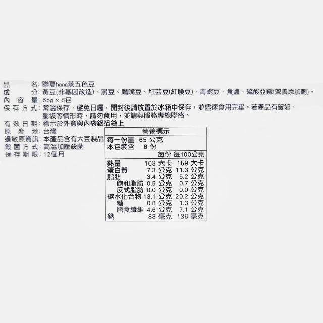 聯夏Hana 蒸五色豆 65公克 8入 (五色豆 黃豆 黑豆 鷹嘴豆 紅芸豆 紅腰豆 青豌豆 豌豆 植物蛋白 膳食纖維)