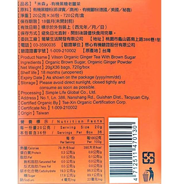 Vilson 米森有機黑糖老薑茶 20公克 36入 (黑糖薑茶 薑茶 黑糖 老薑 薑粉)