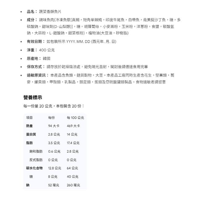 蔬菜香酥魚片 400公克 (韓國 蔬菜 香酥 魚片 蛋白質)