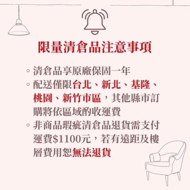 - 針對大型商品(包括:大型家電、家具床墊、健身按摩器材、車類...等),商店將於完成收款確認後,一天內〈不含例假日〉將會有專人與您確認相關配送細節等的聯繫。偏遠地區、樓層費及其它加價費用,皆由商店於約定配送時一併告知,商店將保留出貨與否的權利。