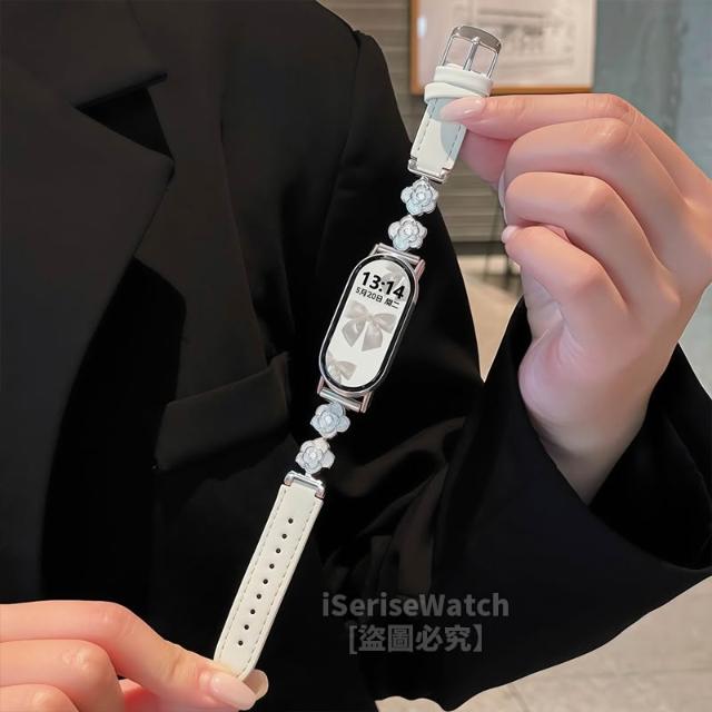 新品 輕奢山茶花 適用小米10/9/8錶帶 小米手環10錶帶 山茶花拼接皮質小米錶帶 小米手環9腕帶小米8錶帶