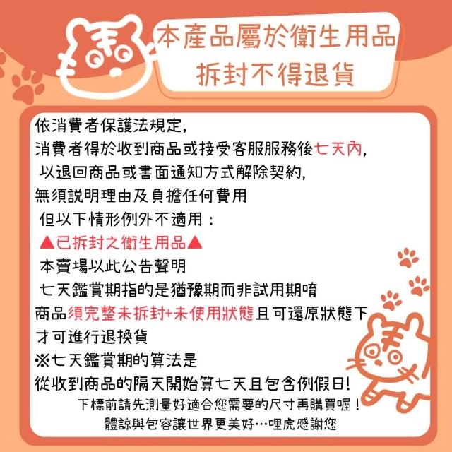 - 個人衛生用品除商品本身有瑕疵外,未拆封商品仍享有十天猶豫期之退貨權利。但已拆封 (如剪標、下水等情形…),依據《通訊交易解除權合理例外情事適用準則》第二條規定,商店無法接受退換貨。