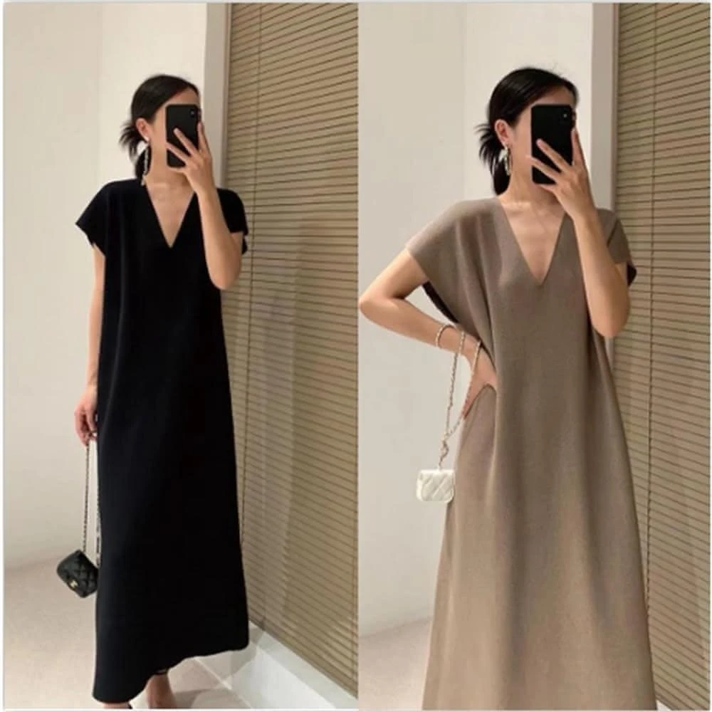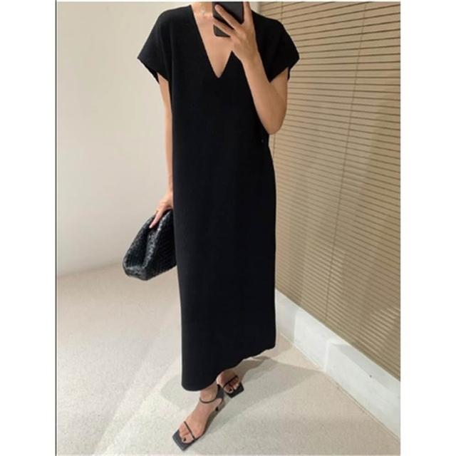 茶歇法式設計感長款寬鬆顯瘦顯高級感簡約洋裝女(大尺碼洋裝 長款洋裝)