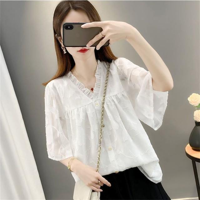 V領純色喇叭袖雪紡衫女夏季新款寬鬆大碼短袖薄款上衣(大尺碼襯衫 雪紡襯衫)