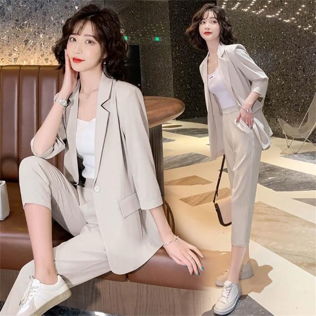 大尺碼西裝外套女夏季新款韓版時尚氣質洋氣休閒兩件套裝(大尺碼套裝 兩件式套裝)