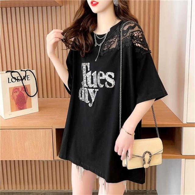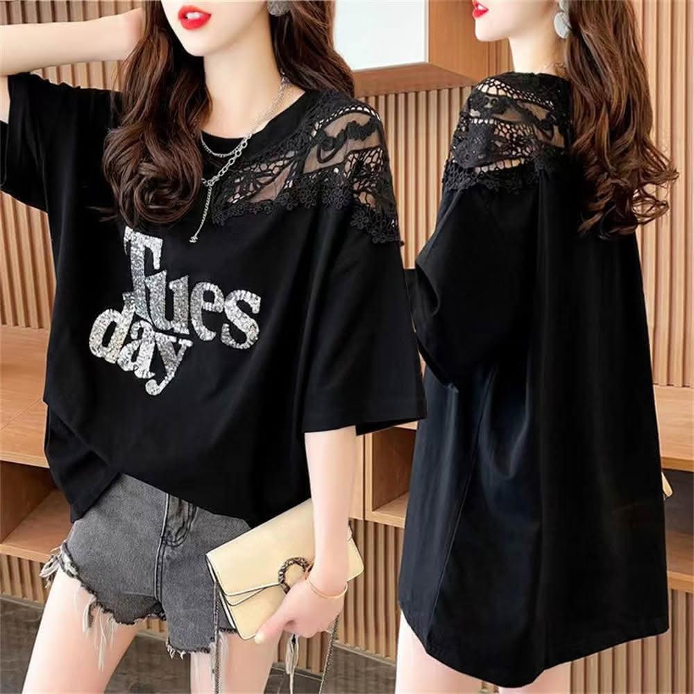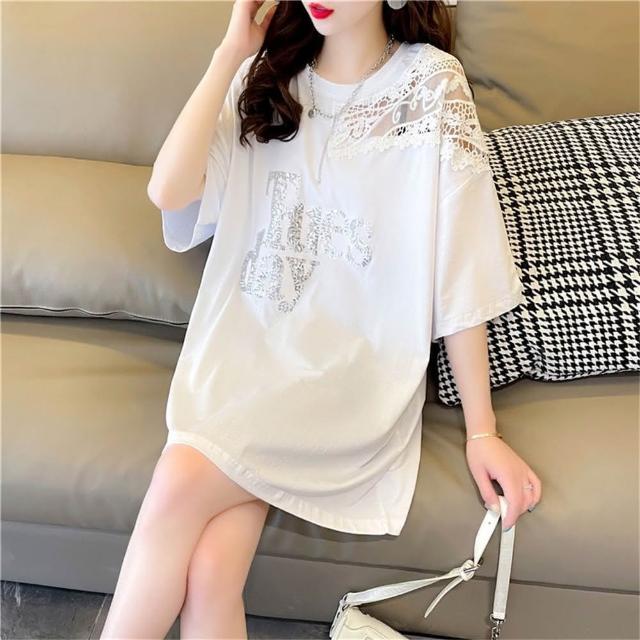 韓版大尺碼女裝設計感蕾絲拼接短袖T恤女夏季洋氣寬鬆上衣(大尺碼上衣 長版上衣)