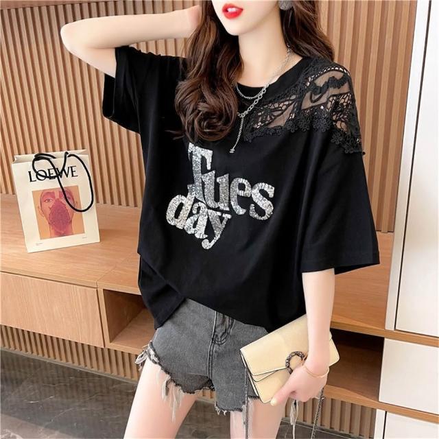 韓版大尺碼女裝設計感蕾絲拼接短袖T恤女夏季洋氣寬鬆上衣(大尺碼上衣 長版上衣)