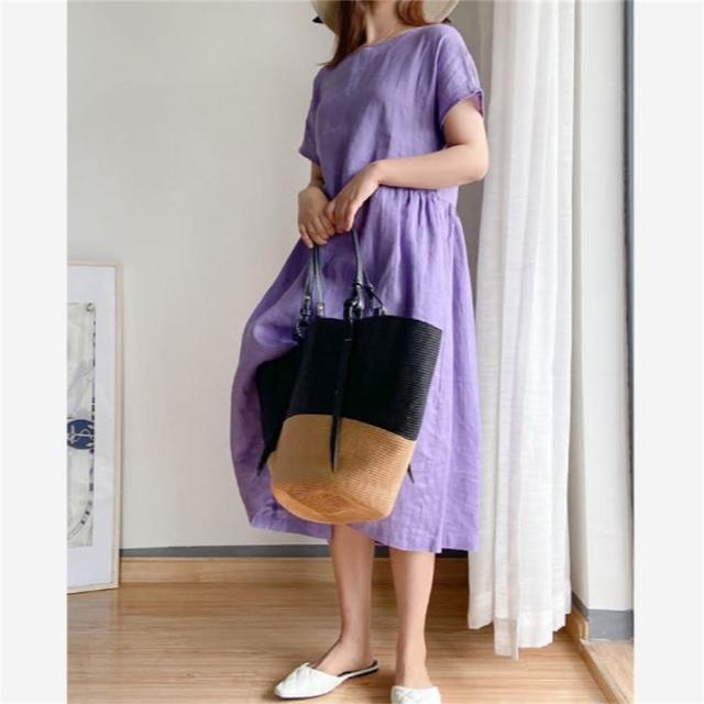 簡約文藝范寬鬆顯瘦純棉連衣裙女夏新款大碼中長款裙(短袖連衣裙 棉麻洋裝)