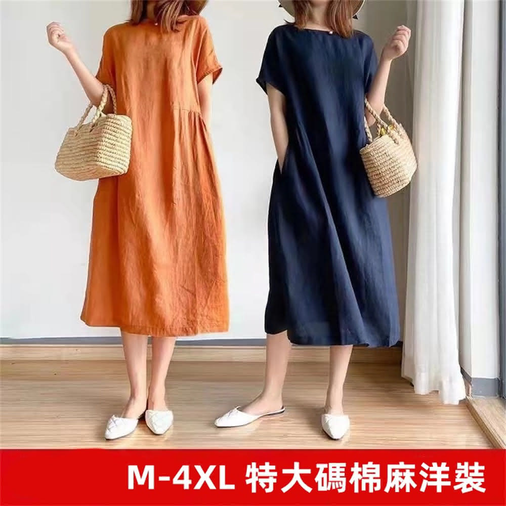簡約文藝范寬鬆顯瘦純棉連衣裙女夏新款大碼中長款裙(短袖連衣裙 棉麻洋裝)