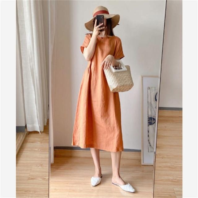 簡約文藝范寬鬆顯瘦純棉連衣裙女夏新款大碼中長款裙(短袖連衣裙 棉麻洋裝)