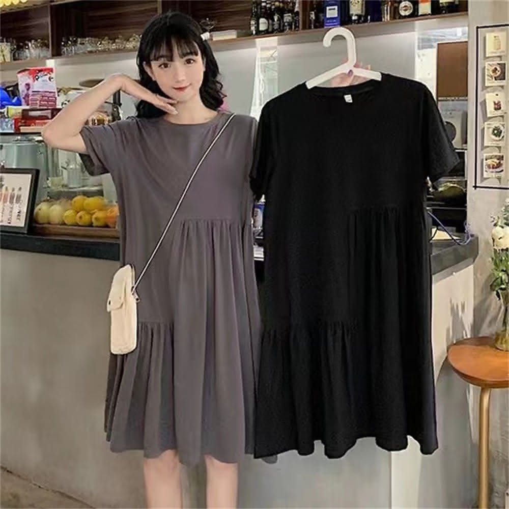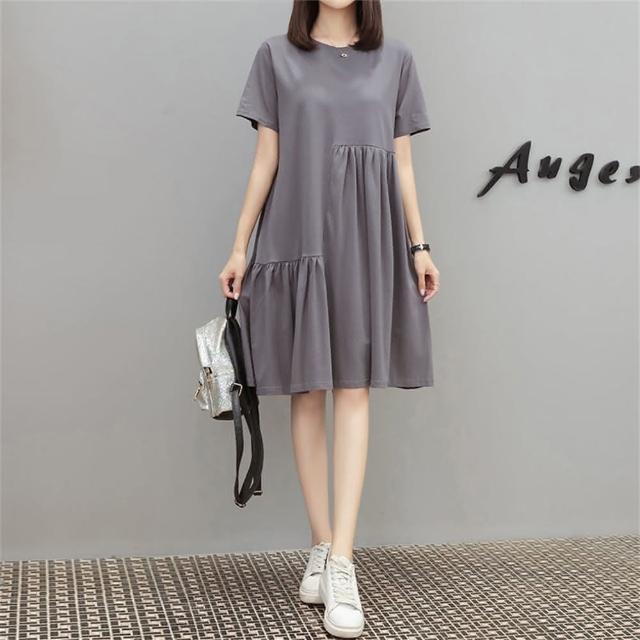 洋裝大尺碼寬鬆韓版褶皺不規則拼接遮肚顯瘦裙子女(拼接連衣裙 大尺碼洋裝)