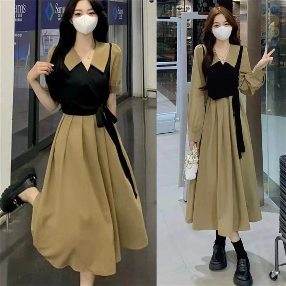 法式假兩件連衣裙女夏季新款設計感收腰顯瘦茶歇裙爆款連衣裙(大尺碼洋裝 假兩件連衣裙)
