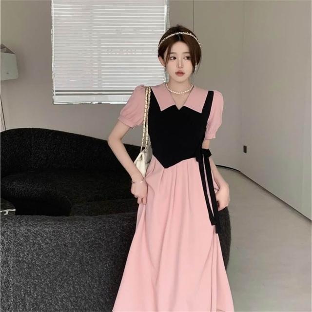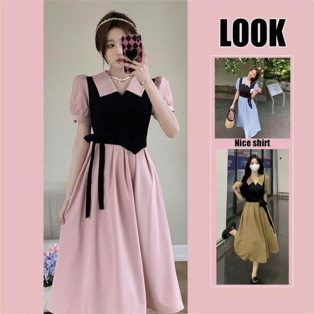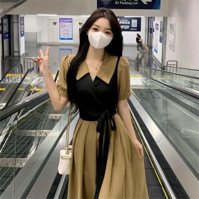 法式假兩件連衣裙女夏季新款設計感收腰顯瘦茶歇裙爆款連衣裙(大尺碼洋裝 假兩件連衣裙)
