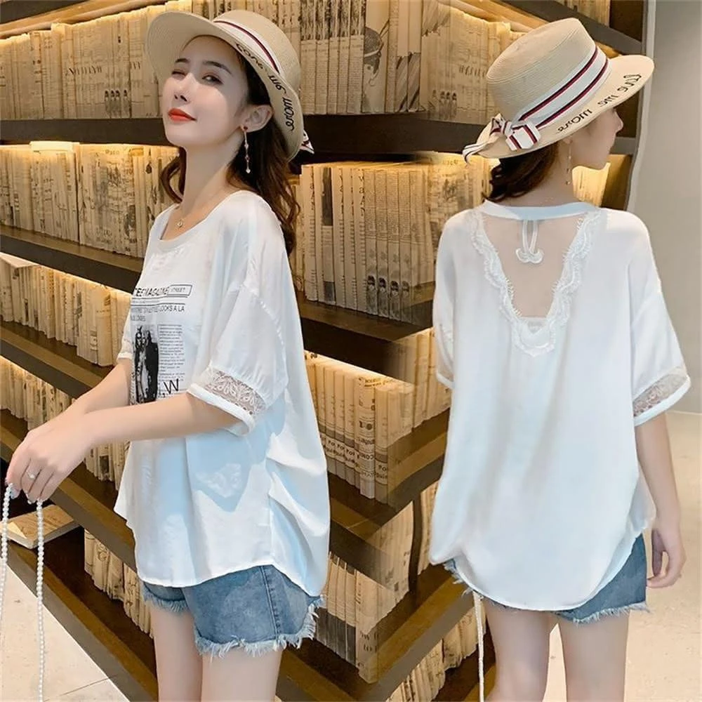 夏裝韓版大碼寬鬆短袖t恤女小心機蕾絲拼接網紗露背上衣(韓風大碼)