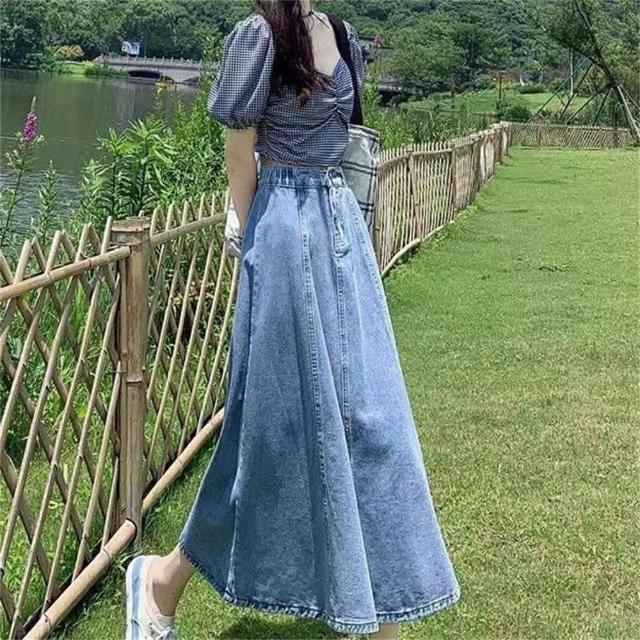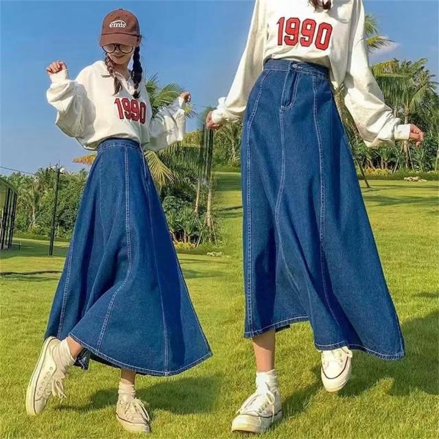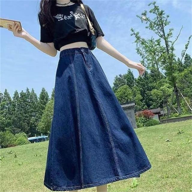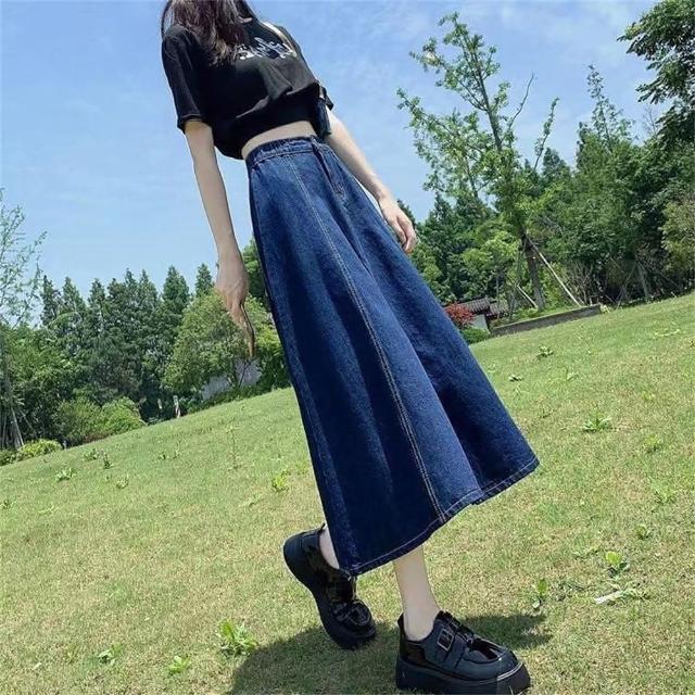 半身裙女長裙新款春夏中長款牛仔裙百褶高腰顯瘦a字垂感傘裙(韓風大碼)