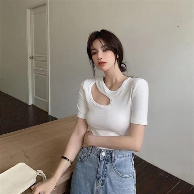 V領低胸修身短袖t恤女夏大碼韓版黑色半袖上衣百搭鏤空(韓風大碼)