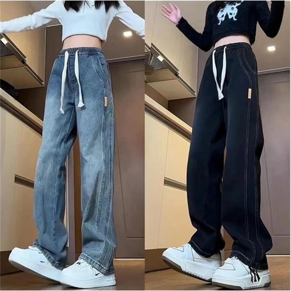 牛仔褲抽繩直筒牛仔褲春秋新款高腰寬松闊腿垂感拖地長褲(韓風大碼)