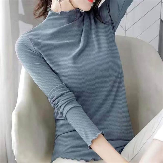 螺紋打底衫女木耳邊半高領修身長袖t恤白色百搭上衣(韓風大碼)